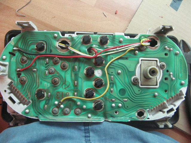 הלחמתי שלוש צמות עם הלדים והנגדים, אחת לכל צד בלוח עם לדים ירוקים ועוד אחת עם לדים אדומים לקילומטרז. הדסקתי אותם עם RTV (זה מה שהיה) למקומות שלהם והלחמתי את הצמות למגעים של אחת הנורות שנדלקות עם האורות.