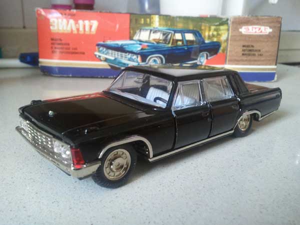 המודל עצמו מתוצרת ברה"מ, מוכן, עשוי ברזל כמובן וכבד כמעט כמו האורגינל שלו... קנ"מ 1:43 (ועדיין הוא גדול יחסית, כי במציאות זה רכב ענק) עם דלתות ומכסי מנוע ובגאז' נפתחים ומנוע די מפורט. הוא כמובן לא מדויק על קוצו של יוד כמו בקנ"מים גדולים יותר, בטח לא כמו מודלים של חברות מערביות מובילות אבל עדיין הוא מאוד מרשים, במיוחד כי מדובר במשהו סובייטי עתיק שיוצר (המודל עצמו, לא רק המכונית שהוא העתק שלה) בתחילת שנות השבעים. קיבלתי את זה במתנה בקופסה המקורית (חשוב מאוד) ממישהו ששמר את זה המון שנים אחרי שקיבל בעצמו במתנה ממישהו שעלה אז מברה"מ. להבנתי המודל הזה שווה לא מעט היום.