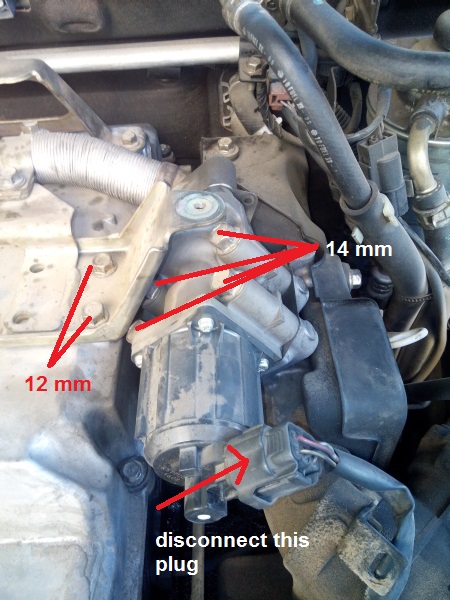 3. מנתקים את הפלאג של ה EGR, מורידים את התושבת של הפלסטיק השחור ע"מ לפנות גישה לברגים של ה EGR ואז מורידים את ה EGR עצמו (ברגי 12 מ"מ ו 14 מ"מ):