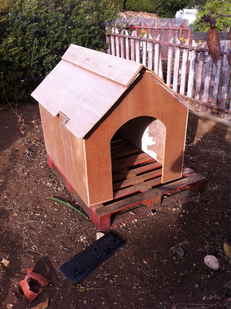 בניתי לו סוג של סככה נמוכה, גג עם 2 קירות אחורי ארוך, צד אחד בשביל תמיכה ובכל זאת הגנה מסוימת מהצד של הרוחות בערב, ורצפה, כדי שלא יהיה על האדמה.