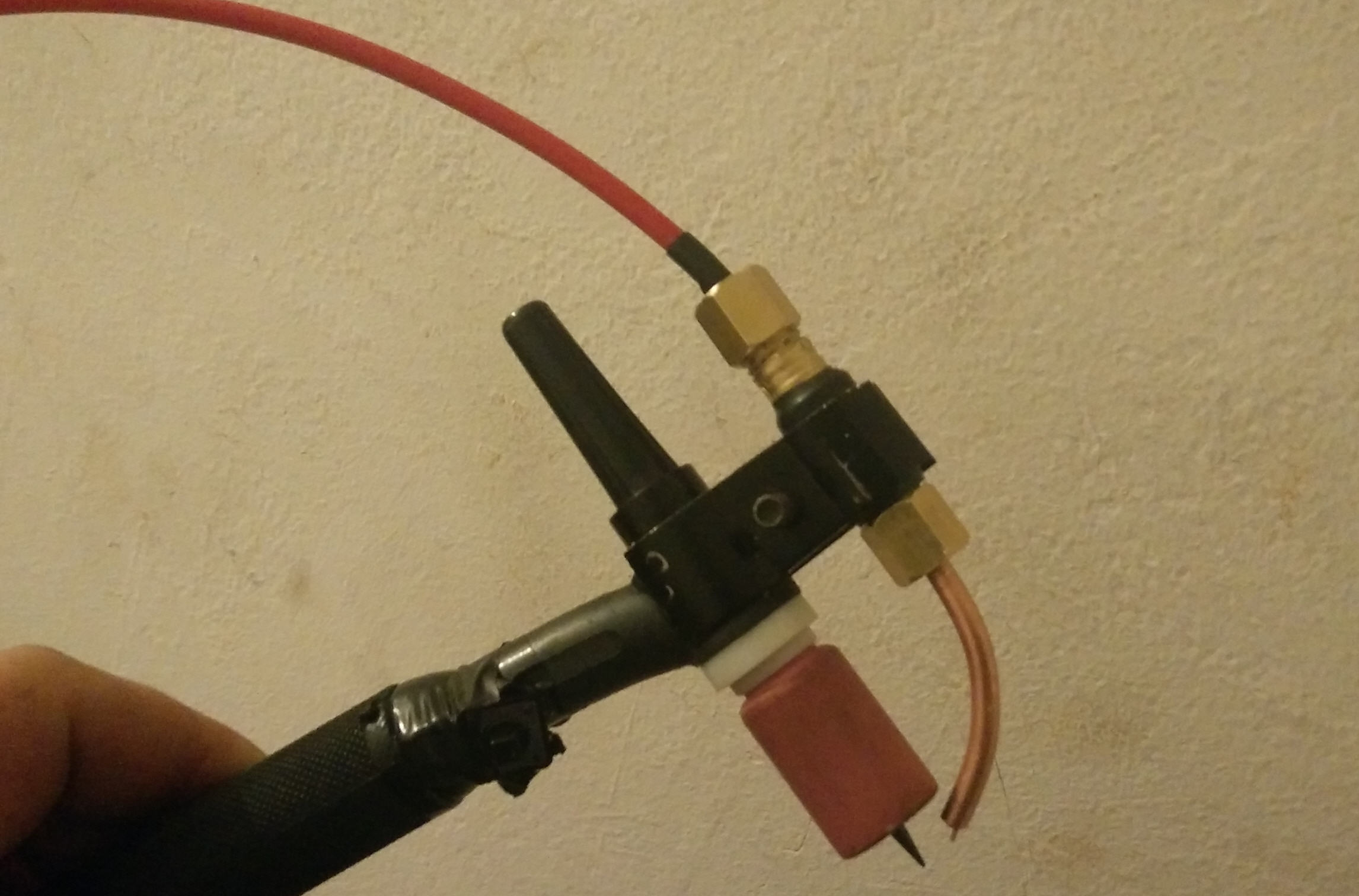ידית הטיג מתחברת כמו ידית מיג, חיבור euro/בינזל. כדי שזה יעבוד צריך היה לעשות שינוי קטן בחיבור, להפריד בין ההזנה של החוט להזנה של הגז, שבמיג עוברים ביחד בתוך הכבל. כאן, בחיבור שבתמונה, הגז בצינורית נפרדת והמוליך האדום עבור החוט.