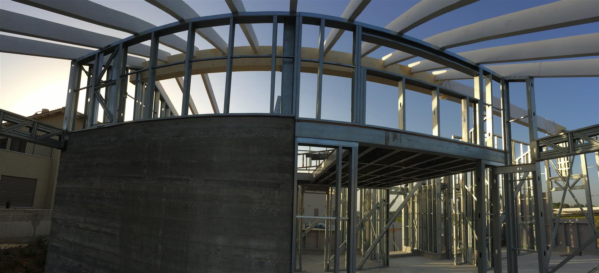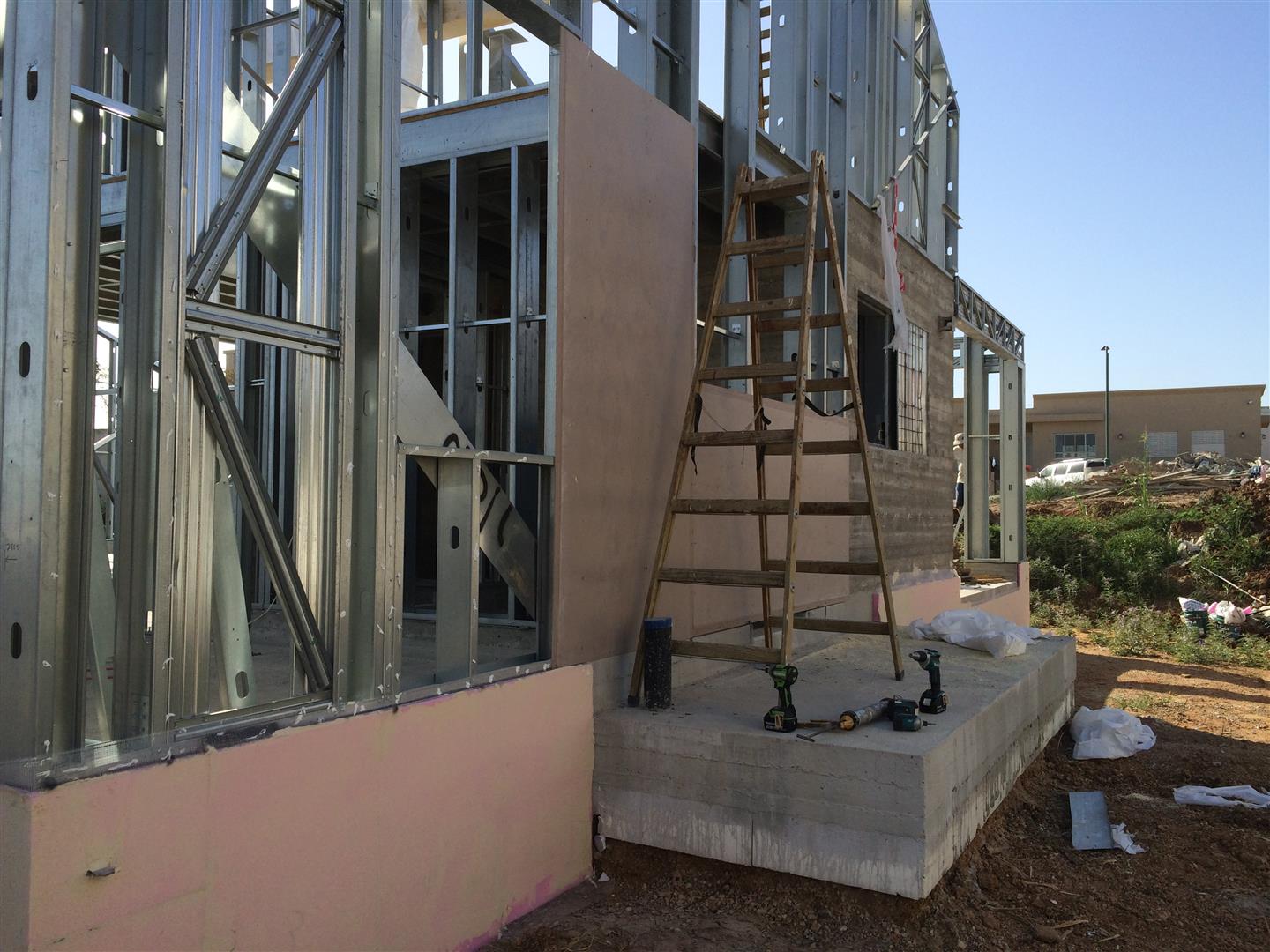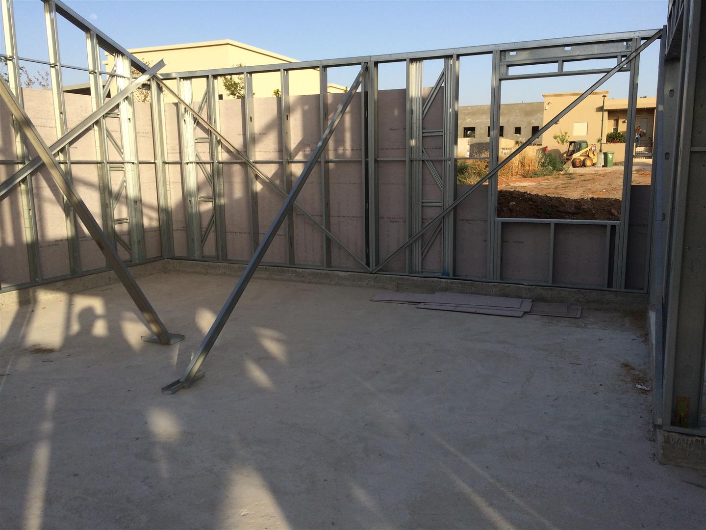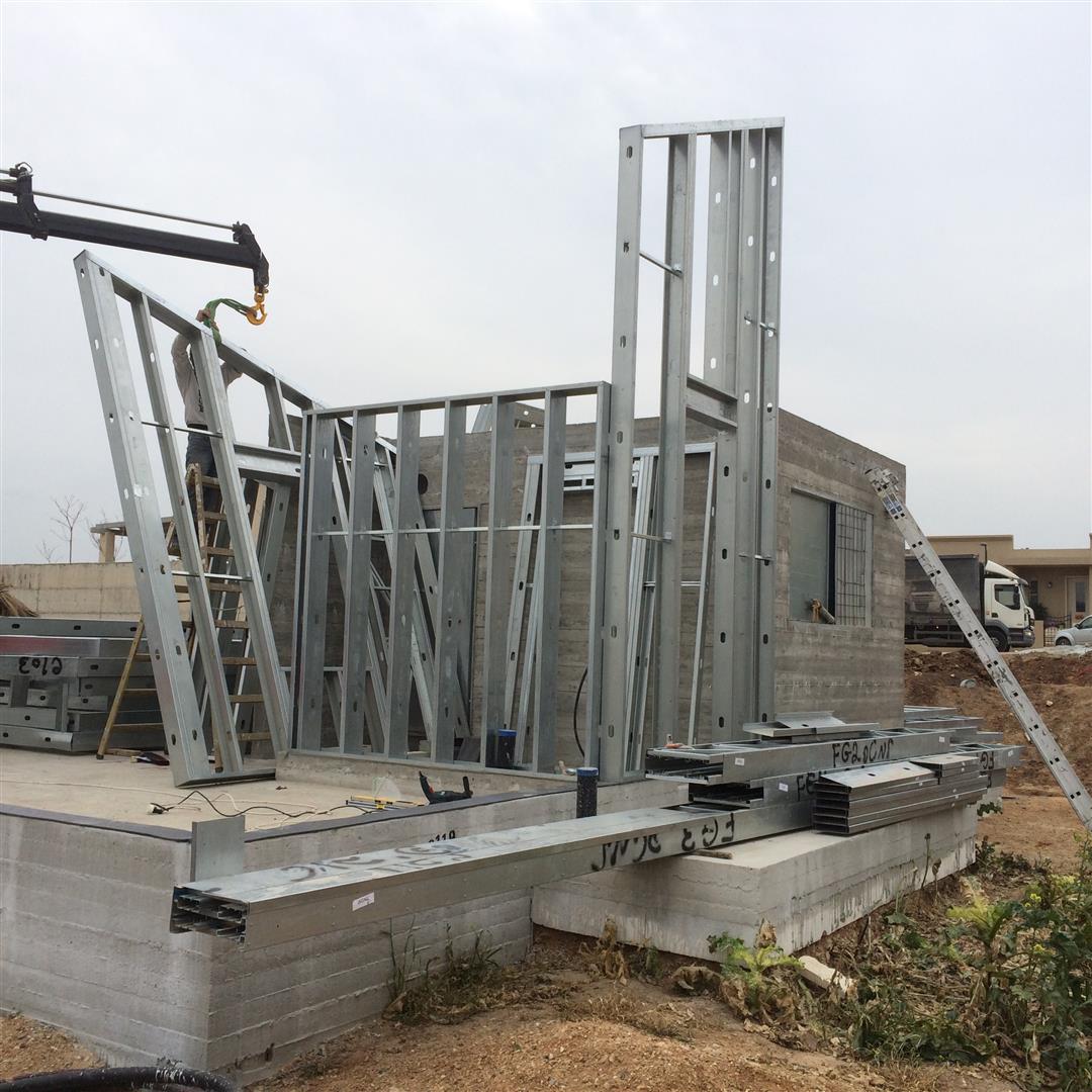 לאחר שכל השלד עומד ומפולס וקורות יסוד מבודדות, מתחילים עם הרכבת הגג והשכבה הראשונה של החיפוי החיצוני (חתך קיר (מבפנים החוצה) של 2 פלטות גבס 12.5 מ"מ - ניצבי פלדה וביניהם 150 מ"מ צמר אדמה מירלי - פלטה צמנטית (וילהבורד) בעובי 6.5 מ"מ - יריעת חסם אדים - לטות עץ 50X40 - פלאנקים צמנטיים בעובי 14מ"מ)