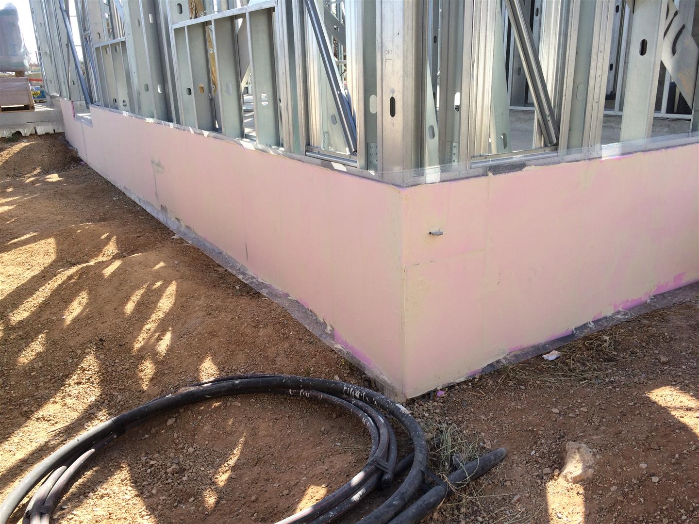 לאחר מכן, הדבקתי קלקר לבידוד של קורות היסוד מהבטון, גם לעזור לשכבת האיטום לא להיפגע מהמילוי של האדמה וגם לבודד את הבטון מהאדמה.