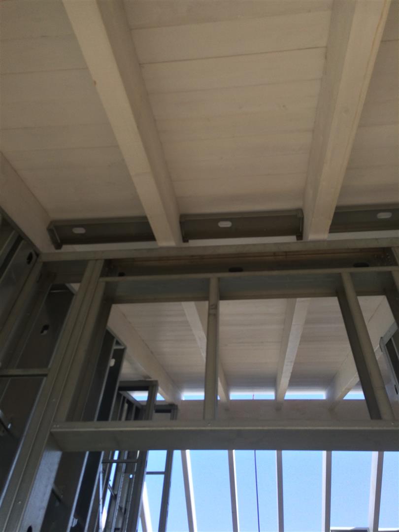 קודם צריך להוסיף פרופיל פלדה בין הקורות עץ כדי שיהיה אפשר להתחבר עם הפלטה הצמנטית. (התמונה הבאה היא של קיר פנימי אומנם, אבל העיקרון בקירות חוץ זהה)