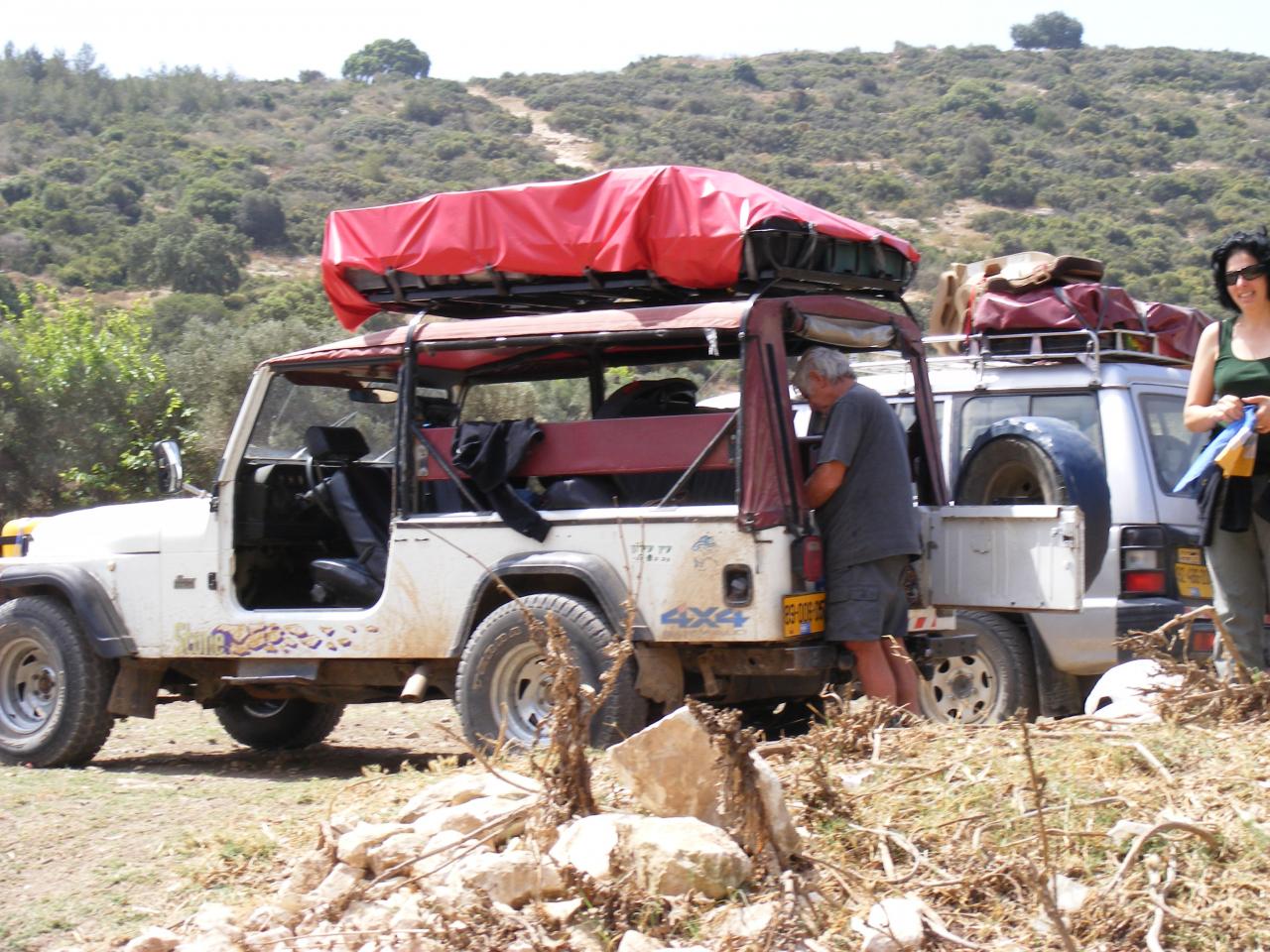 אני מעמיס על הגג (גג ברזנט, מתוח על כלוב התהפכות) שק גדול עשוי שמשונית שמכיל מזרונים, אוהל, מצעים, כסאות מתקפלים, שולחן מתקפל, כל מה שתופס הרבה נפח אבל לא כבד אבסולוטית.