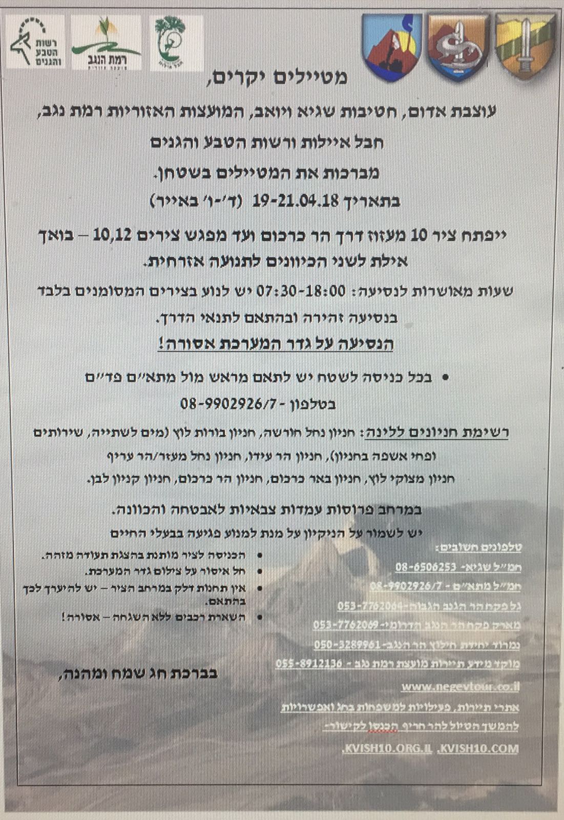 יהיה פתוח בין התאריכים 19-21.4.18 לתנועת מטיילים. מעזוז דרך הר כרכום ועד מפגש הצירים 10/12. התנועה תהיה מותרת בין 7:30-18:00