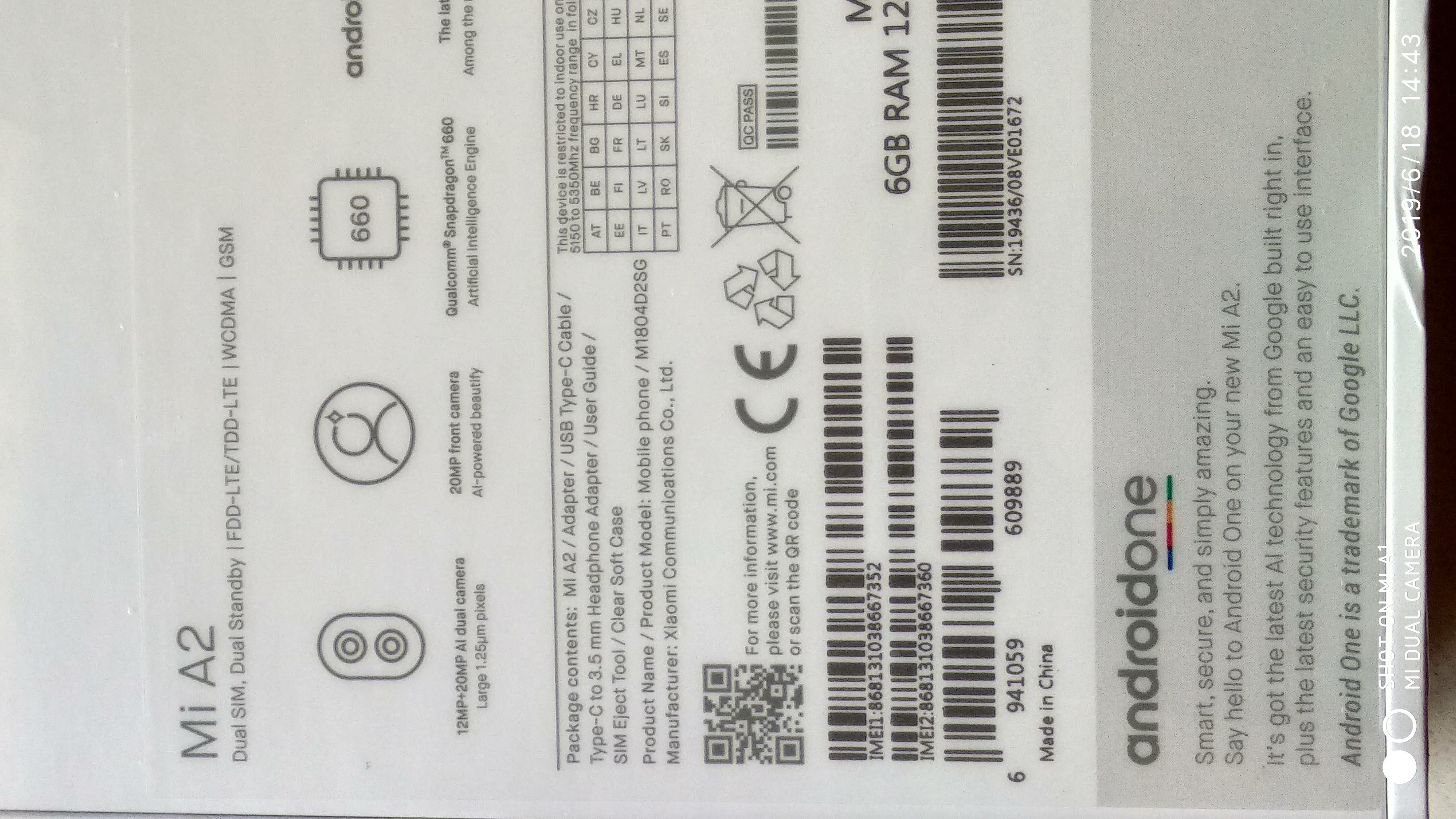 Global Version Xiaomi Mi A2 6GB 128GB 5.99" 18:9 Full Screen Snapdragon 660 20MP Front Camera Android One OS Smartphone