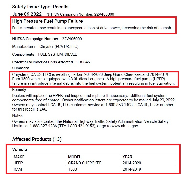 RECALL for Dodge\Cherokee 3.0 DIESEL High Pressure Fuel Pump Failure