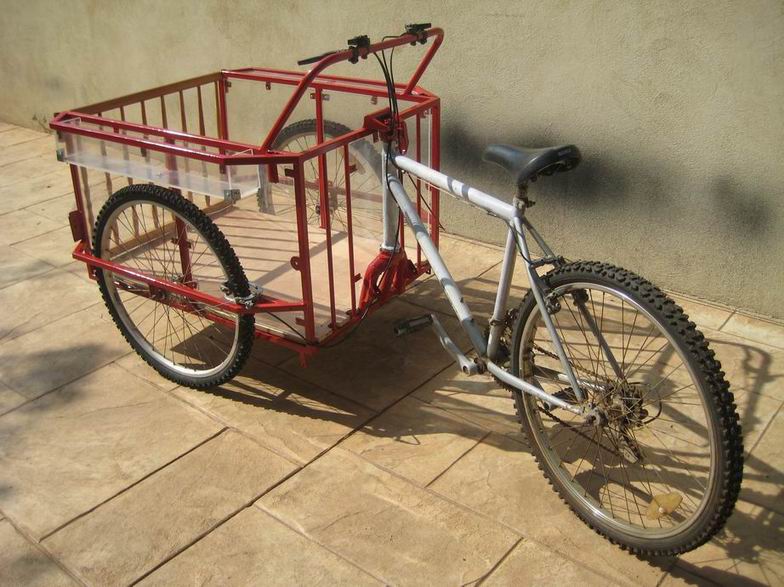 המצרכים – זוג אופניים ישנים, גלגל אחד נוסף, 18 מ' 20X20X2.5 שחור, קצת צינור 0.5X2.2 שחור, בערך 1.4X1.4 מ' פרספקס שקוף, לוח עץ, וציר קדמי של איזושהי שלדת קטנוע. אה כן, וגם קיר צד של מיטת תינוק ששימש ב-10 השנים האחרונות כמחסום עגלים, באדיבות תומר א.