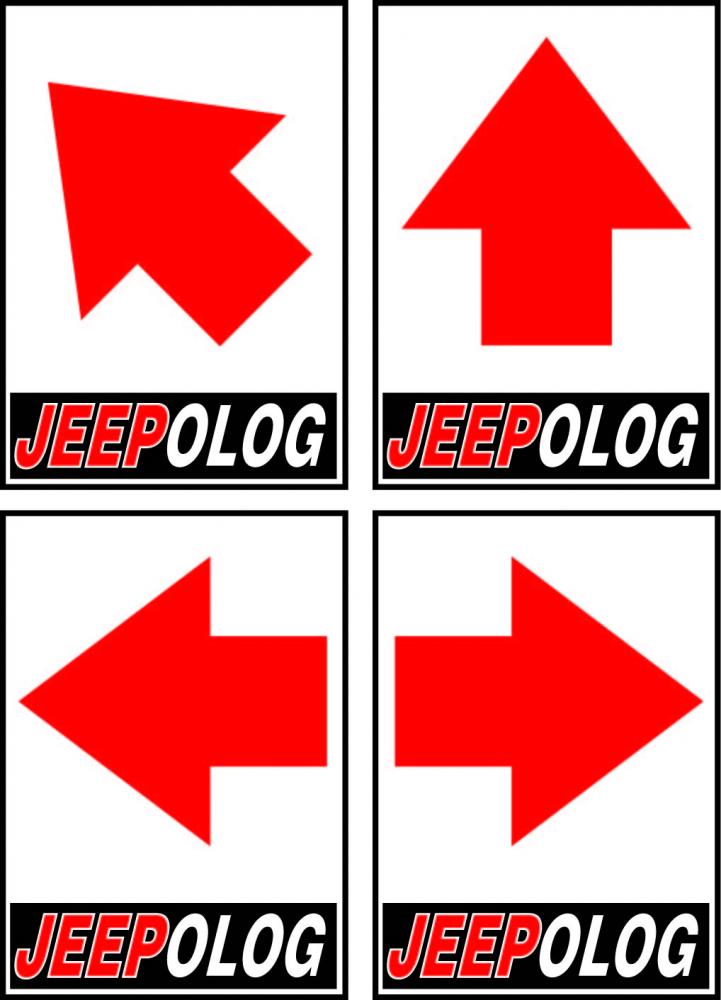 חפשו את השלטים האלה: חץ אדום ובולט על רקע לבן והכיתוב JEEPOLOG על רקע שחור, כמו במדבקה.