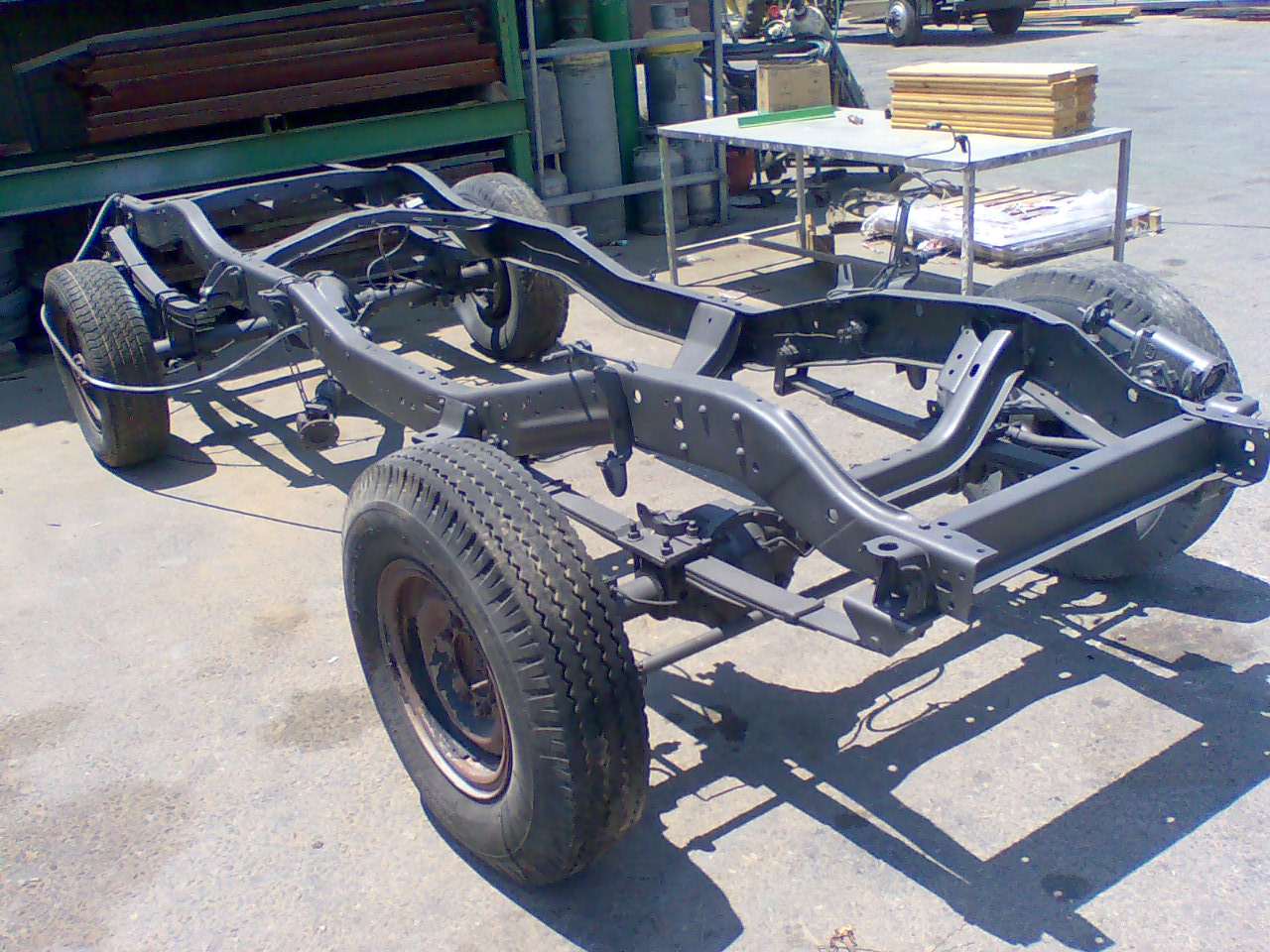 מיכל הדלק אחרי ניקוי חול וצבע, הקבינה שמחכה לרצפה חדשה ואחר כך תעבור אל הפחח שיחדש אותה, השלדה אחרי ניקוי חול וצבע מיוחד וכמובן שגם המנוע עם הגיר שמחכים להיפרד ולאחר בדיקה/החלפה של חלק מהמכלולים הם יצבעו בצבע כסף לחום גבוה.